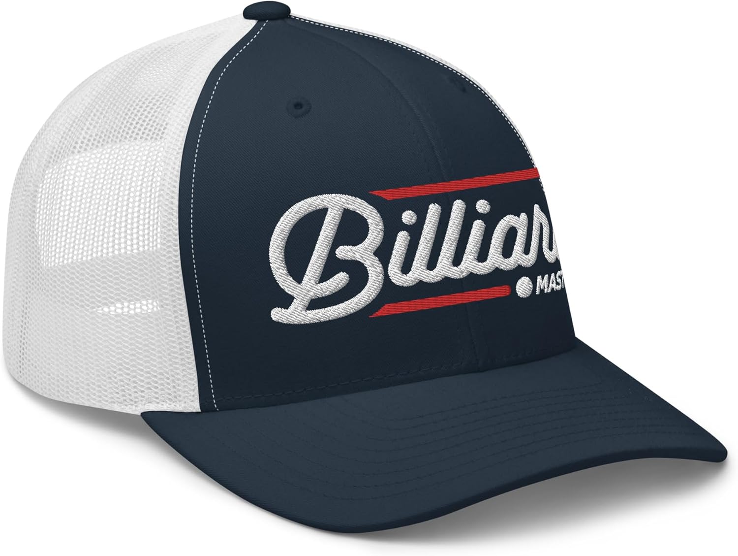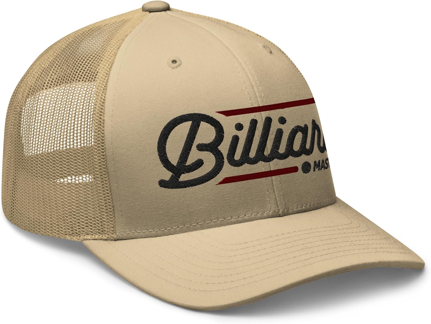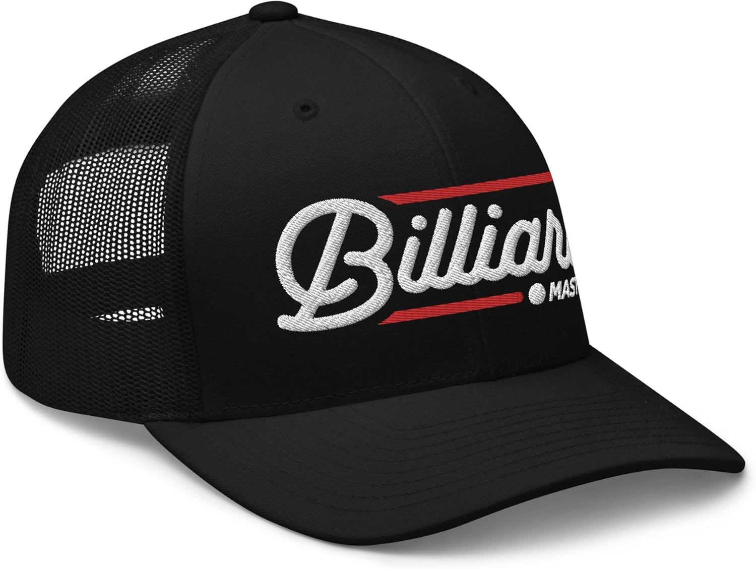 A stylish, mid-profile billiard hat that was created for billiard masters who love shooting pool. Features a humorous, embroidered "Billiard Master" design with retro pool hall inspired text. A funny billiard hat for pool players of all ages and an awesome billiard gift for dad, husband, brother, uncle, friend or billiards player for Christmas, birthday, Father's Day or pool tournament. Mid-profile, structured 6-panel golf billiard hat60% cotton, 40% polyesterHard buckram front panels w/ mesh backPermacurv visor, matching undervisorPlastic snap closureHead circumference: 21⅝” – 23⅝”Type: billiard trucker hat, mesh pool hat, funny billiard hatEmbroidered in the USAGoTime Apparel