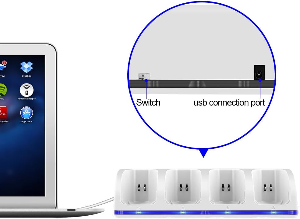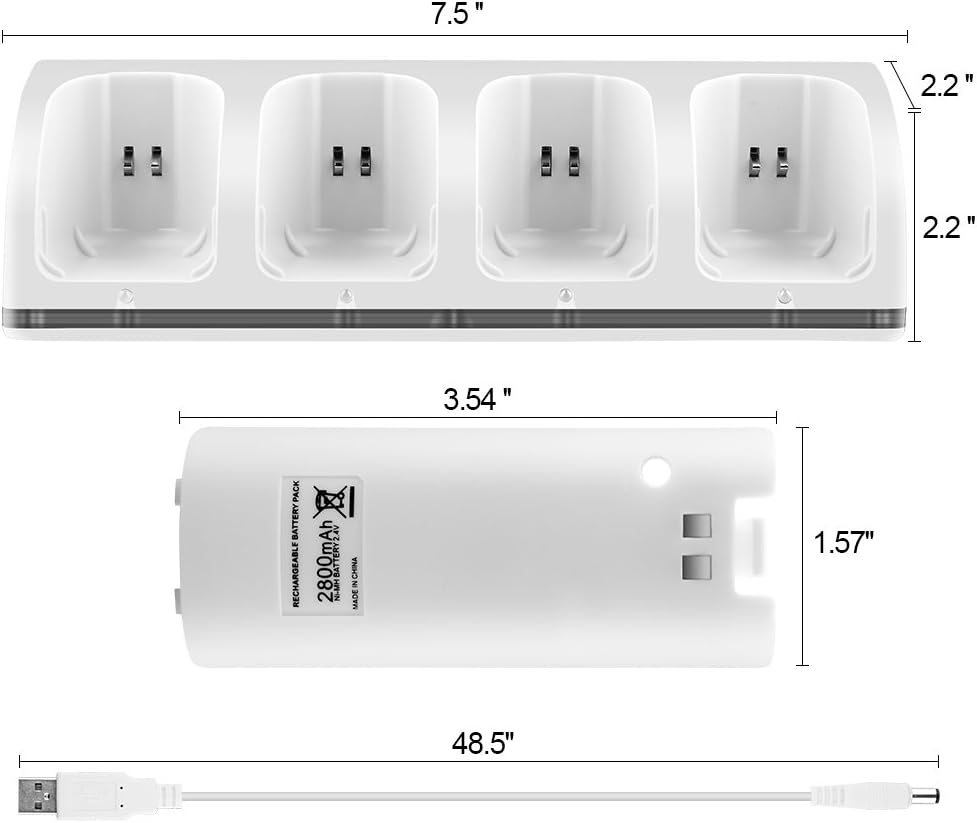 Customer Support: Lifetime warranty and free replacement accessoriesProduct details: 1* Remote controller charging station with 4 charging station 4* rechargeable 2800mah batteries 1* USB cable High capacity battery that lasts 2-4 times longer than standard AA batteries Save money and protect the environment by using the rechargeable batteriesSpecifications: Material : Plastic Battery Type : Ni-MH Input DC : 5V Capacity : 2800mah 2.4V Charging statues: red means in charging , green means is fully chargedFeatures: Dock both of your remote and plug it into any USB port. LED light can be show the chargement situation.Notice: Wii remote controller is not included! but NOT with MINI remotes. Please turn on the switch at the back of the charging dock before the charging.Package included: 1 x Wii 4 Charging Station 4 x Rechargeable batteries 1 x USB Cable
